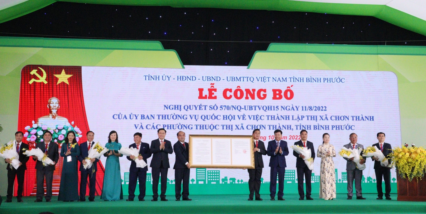 Hôm 01/10, tỉnh Bình Phước công bố Nghị quyết số 570/NQ-UBTVQH15 ngày 11/8/2022 của Ủy ban Thường vụ Quốc hội về việc thành lập thị xã Chơn Thành và các phường thuộc thị xã Chơn Thành, tỉnh Bình Phước.