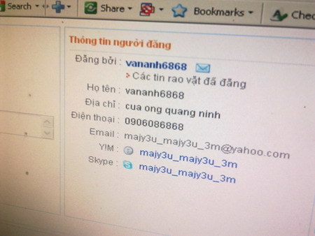 Đến ngày 05/04/2011, khi bị một đối tượng gọi đến tán tỉnh, chị Vân Anh đã bình tĩnh dò hỏi và được biết là khi người ta vào mạng để chat thì nhận được thông tin rao vặt từ trang web vatgia... nên có số điện thoại trên.