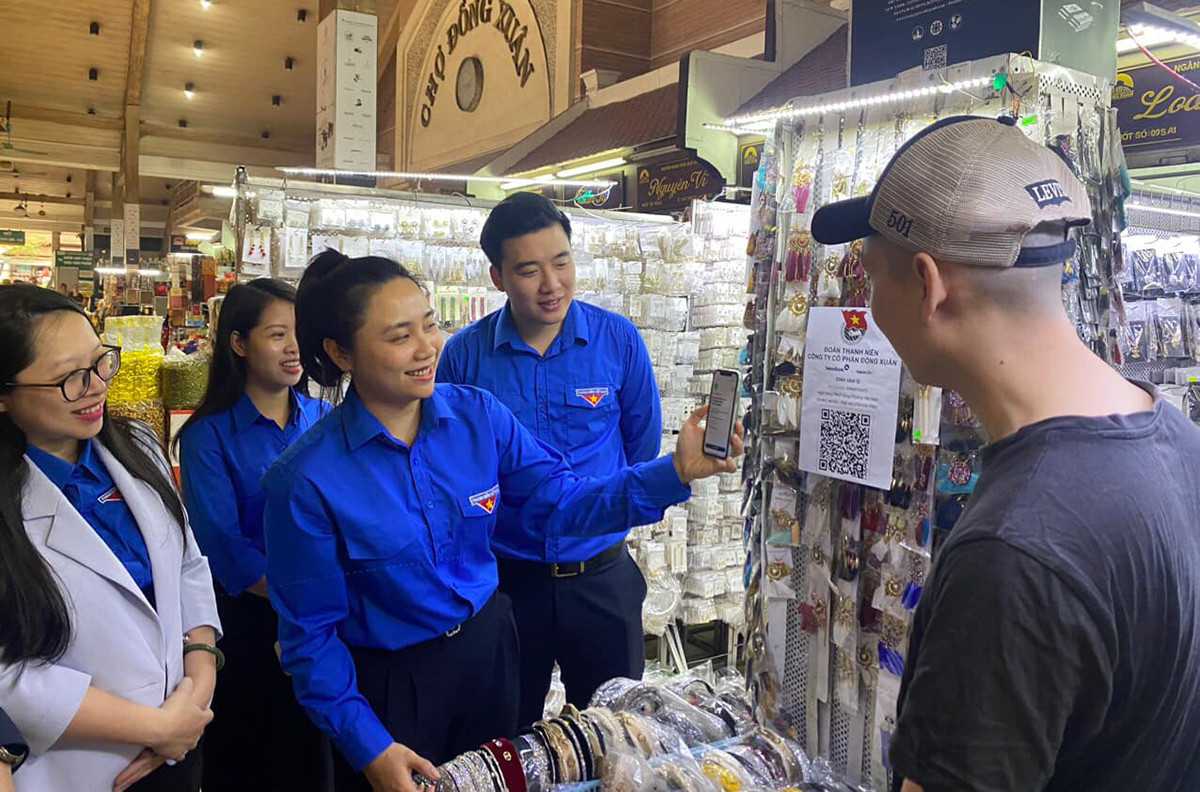 Tận dụng thế mạnh am hiểu công nghệ thông tin, các đoàn viên, thanh niên cũng tích cực thu thập thông tin của các tiểu thương, các hộ kinh doanh trên địa bàn đặc biệt là khu vực chợ Đồng Xuân để trao cấp mã QR sử dụng trong giao dịch buôn bán. Bên cạnh đó các đoàn viên cũng nhiệt tình tuyên truyền, vận động người bán khuyến khích khách hàng sử dụng giao dịch không dùng tiền mặt.