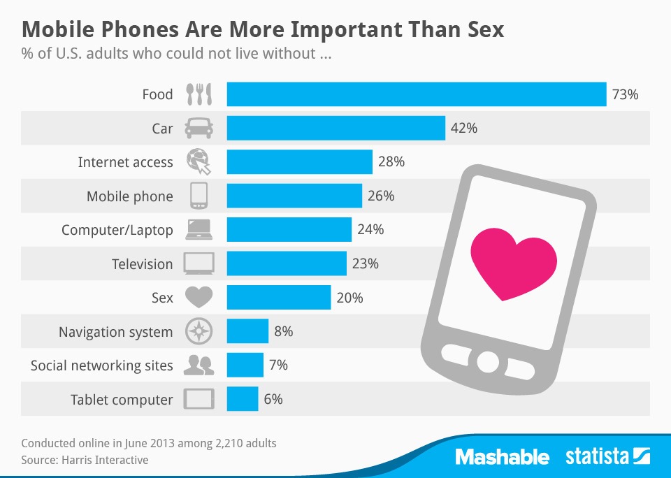 Mặc dù các nghiên cứu đã chứng tỏ rằng mọi người thích sex hơn Facebook, tuy nhiên, theo những con số thống kê mới từ tổ chức Harris Interactive, ngày càng nhiều thanh niên Mỹ có thể sống không sex còn hơn là thiếu các thiết bị di động.