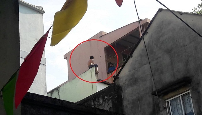 | Thanh niên cởi trần ngồi vắt vẻo trên tầng 3 nhà dân |