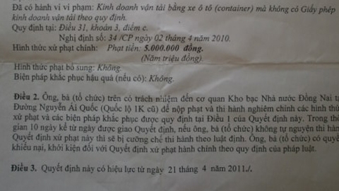 Mỗi trường hợp tài xế thiếu “Giấy phép kinh doanh” bị Thanh tra GTVT Đồng Nai phạt 5 triệu đồng |