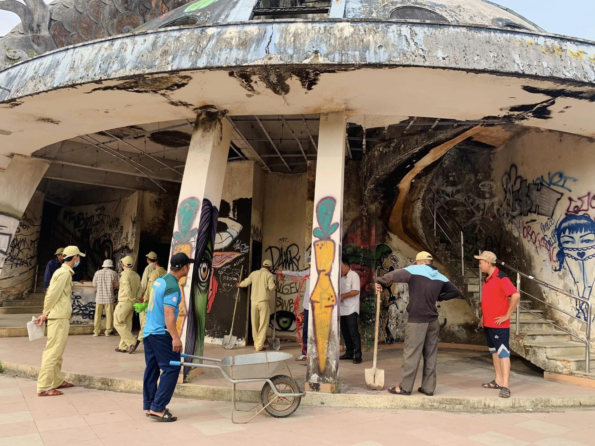 Đồng thời, đơn vị cũng thực hiện tháo dỡ những vật nguy hiểm như dây điện, giàn sắt và mái kính vỡ tại khu thủy cung hình rồng.