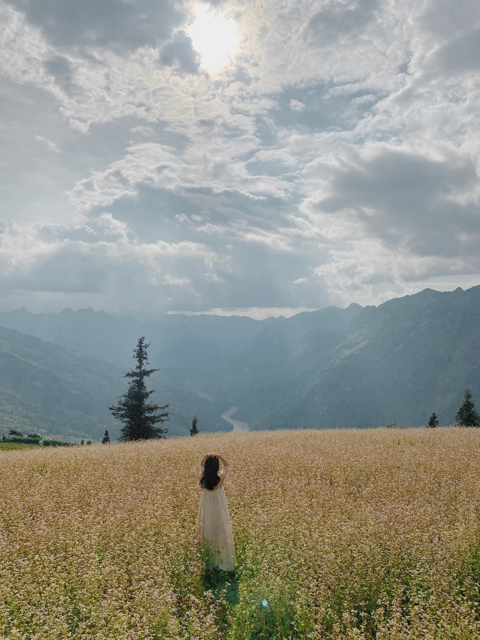 Cô gái La Mộc (quê Hà Giang) vừa từ Hà Nội trở về thăm quê và check-in bộ ảnh với thảo nguyên Suôi Thầu. Theo chia sẻ của Mộc, du khách nên kết hợp cung Bắc Quang - Quang Bình - Đèo Gió - Xín Mần hoặc Bắc Quang - Su Phì - Xín Mần - Quang Bình - Đèo Gió để có thể chiêm ngưỡng mùa lúa chín bản Phùng, Thông Nguyên, có nhiều góc chụp ảnh vô cùng đẹp.
