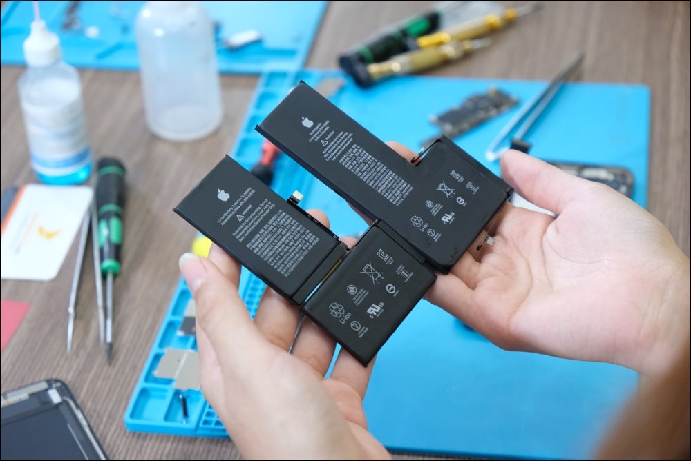 Nếu iPhone Xs Max viên pin được kết nối từ 2 phần nhỏ thì iPhone 11 Pro Max pin là một khối liền mạch dạng chữ L. Tính năng sạc nhanh trên thế hệ iPhone mới cũng một phần đến từ việc sạc trực tiếp vào pin, không phải thông qua nhiều main board. Pin của iPhone 11 Pro Max có dung lượng lớn hơn (3696mAh so với 3174mAh) nên dày và nặng hơn.