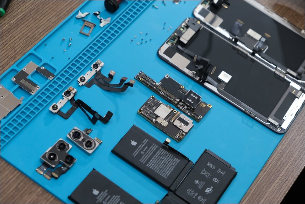 Toàn bộ linh kiện iPhone 11 Pro Max sau khi tháo, đặt bên cạnh linh kiện iPhone Xs Max. |