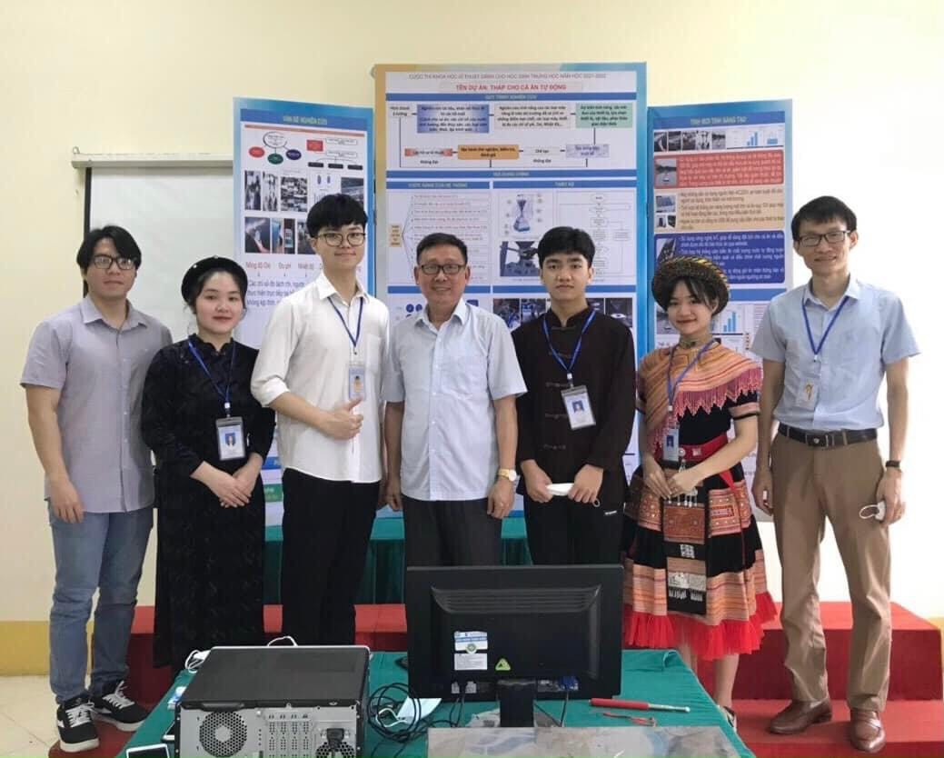Chế tạo Tháp cho cá ăn tự động là ý tưởng của Dương Thu Trang và Nguyễn Minh Đức, học sinh lớp 11 Trường Hữu Nghị 80 (Hà Nội).