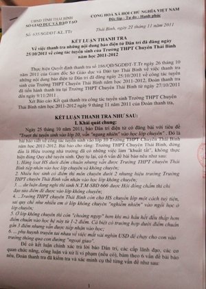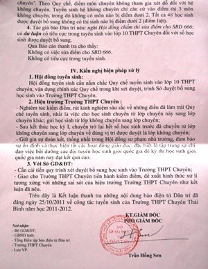 Sau khi có những xác minh về những nội dung phụ huynh phản ánh trong đơn thư, thanh tra Sở GD&ĐT Thái Bình đã khẳng định: “Hội đồng tuyển sinh trường THPT Chuyên Thái Bình mà đứng đầu là hiệu trưởng đã giải quyết cho một số học sinh chuyển lớp chuyên, nghiêm trọng hơn đã cho một số em từ lớp không chuyên gửi vào học lớp chuyên là sai quy chế”.