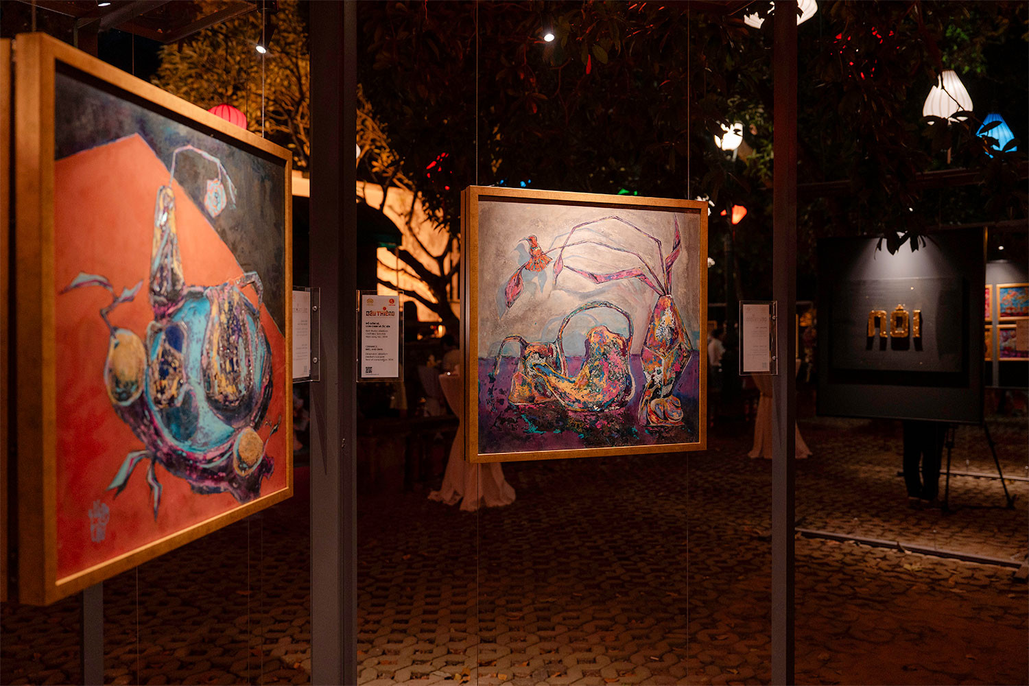 Chủ đề Khởi gồm 14 bức tranh sơn mài tập trung vào thể loại tĩnh vật, thể hiện sự chiêm nghiệm những giá trị thẩm mỹ của cuộc sống.