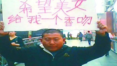 Chàng trai với tấm biển “xin nụ hôn của mỹ nữ” (Ảnh: Tiexue.net)
