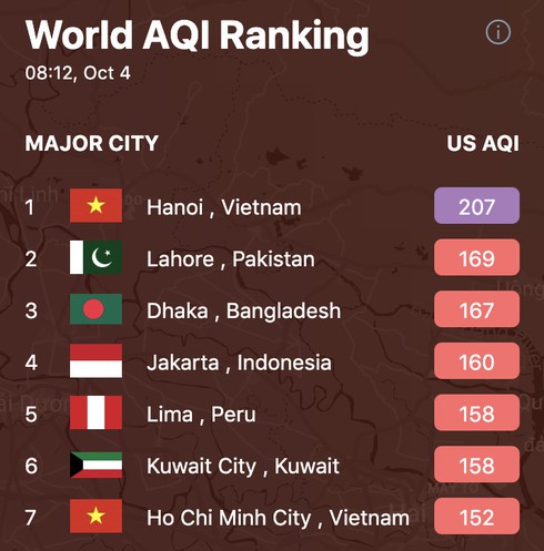 | Air Visual sáng 4/10 xếp Hà Nội đứng đầu các thành phố ô nhiễm. Ảnh chụp màn hình. |