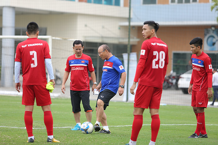 Hai buổi tập chuẩn bị cho cuộc đọ sức Afghanistan, HLV Park Hang Seo liên tục phải trực tiếp thị phạm cho các cầu thủ. Ông thầy người Hàn Quốc thường xuyên cho “dừng hình” để thị phạm, thậm chí có nhiều tình huống đã phải nổi nóng vì các học trò thực hiện chưa đúng với yêu cầu.