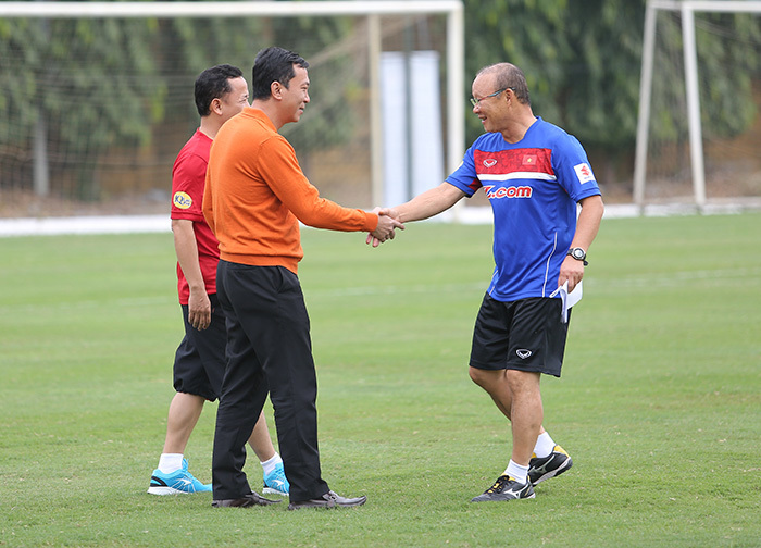 Sáng nay, đội tuyển Việt Nam có buổi tập đầu tiên dưới thời dẫn dắt của tân thuyền trưởng người Hàn Quốc Park Hang Seo. Buổi tập của đội tuyển Việt Nam muộn hơn dự kiến nửa tiếng. Phó Chủ tịch VFF Trần Quốc Tuấn đã ra sân động viên, chúc toàn đội tập luyện tốt