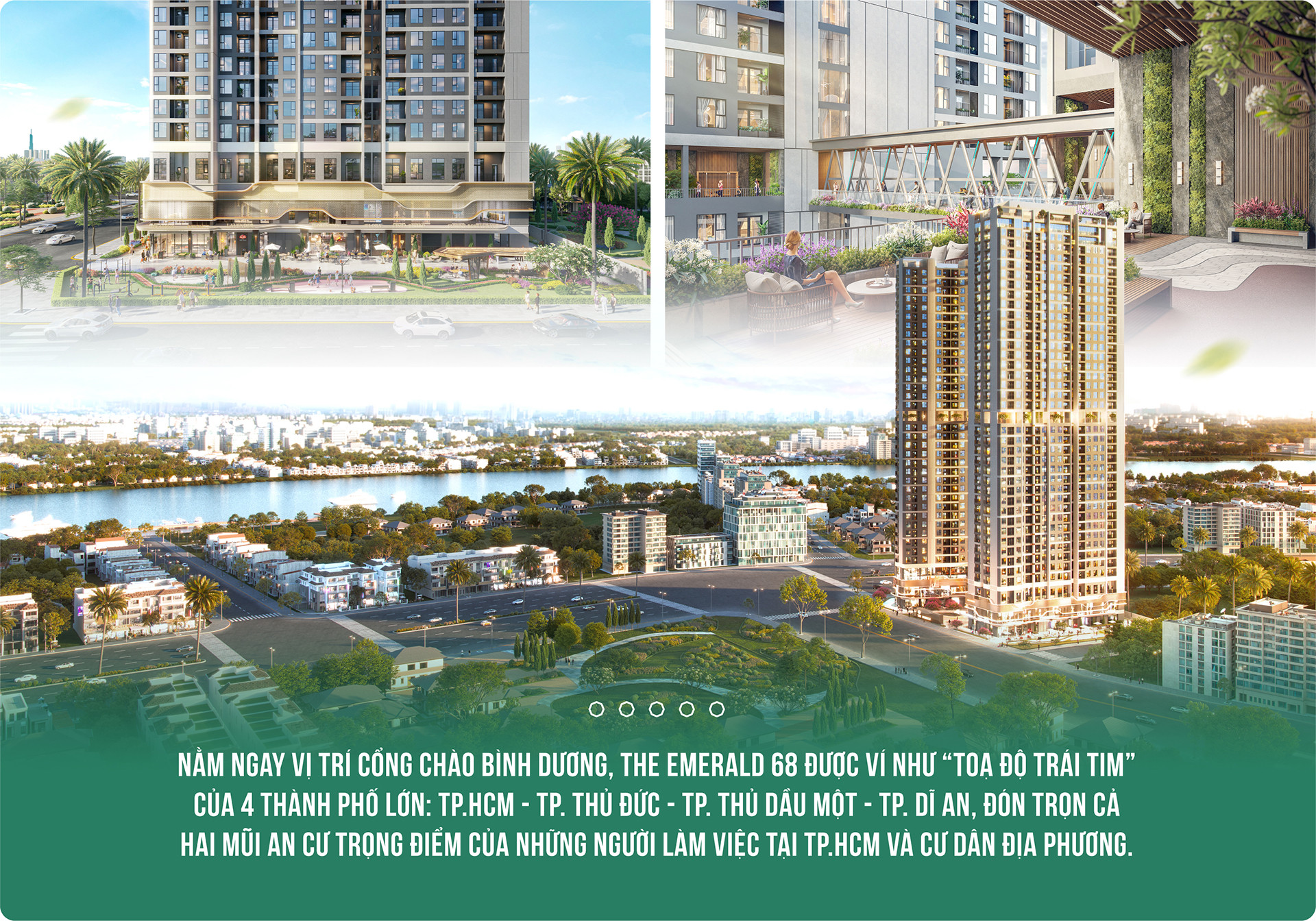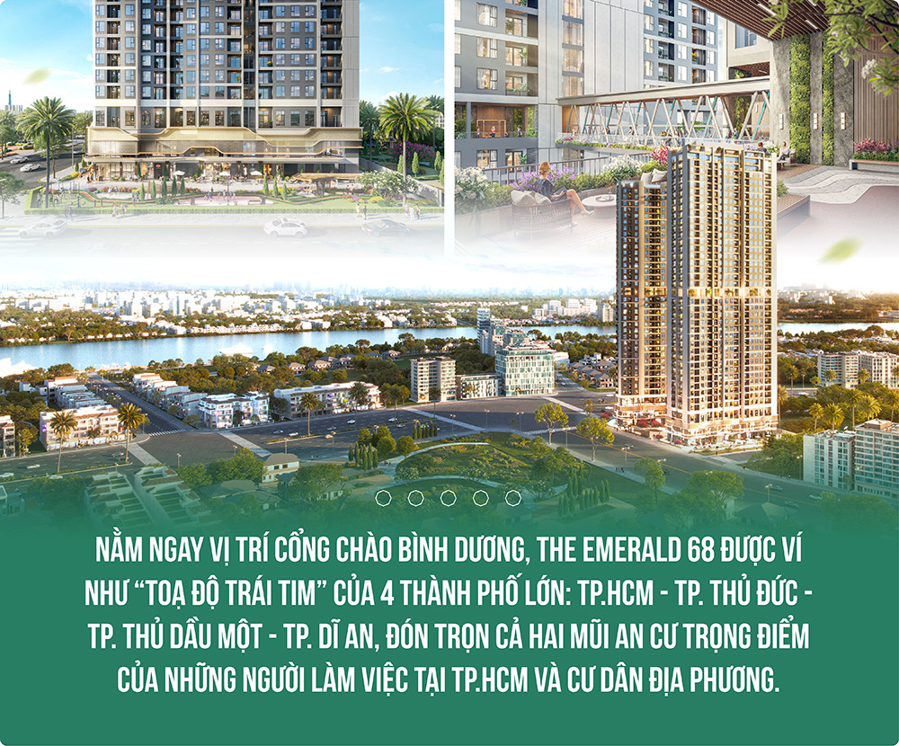 Nằm ngay vị trí cổng chào Bình Dương, The Emerald 68 được ví như “toạ độ trái tim” của 4 thành phố lớn: TP.HCM - TP. Thủ Đức - TP. Thủ Dầu Một - TP. Dĩ An, đón trọn cả hai mũi an cư trọng điểm của những người làm việc tại TP.HCM và cư dân địa phương. Đồng thời, vì giáp ranh TP. Thủ Đức, TP. Dĩ An, TP. Thủ Dầu Một nên cư dân tại dự án dễ dàng tiếp cận các tiện ích cộng đồng của các khu vực đã hiện hữu như: bệnh viện quốc tế Hạnh Phúc, Co.opmart Tam Bình, ngã tư Bình Phước, chợ đầu mối Thủ Đức, Gigamall, White Palace, sân bay Tân Sơn Nhất,... Chính điều này giúp gia tăng giá trị lâu dài cho dự án, xét ở cả góc độ ở, chuyển nhượng và cho thuê.