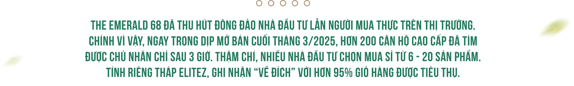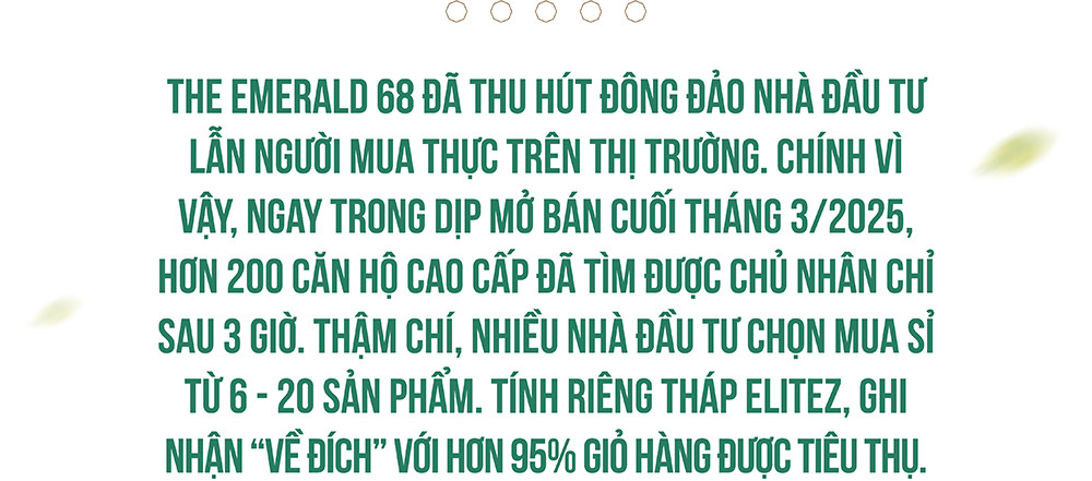 Kể từ khi ra mắt, The Emerald 68 đã thu hút đông đảo nhà đầu tư lẫn người mua thực trên thị trường. Chính vì vậy, ngay trong dịp mở bán cuối tháng 3/2025, hơn 200 căn hộ cao cấp đã tìm được chủ nhân chỉ sau 3 giờ. Thậm chí, nhiều nhà đầu tư chọn mua sỉ từ 6 - 20 sản phẩm. Tính riêng tháp Elitez, ghi nhận “về đích” với hơn 95% giỏ hàng được tiêu thụ.