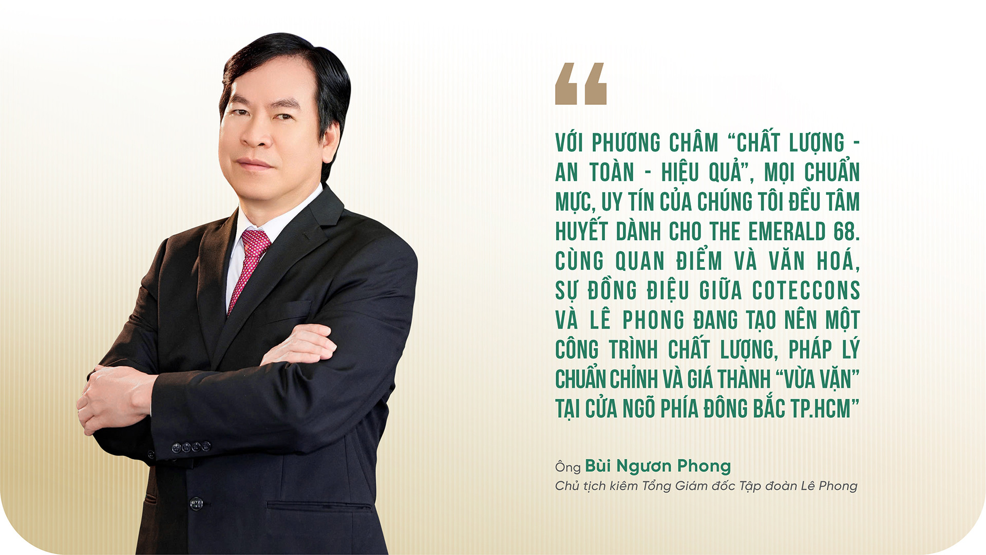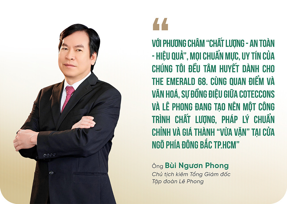 Có thể thấy, “cú bắt tay” giữa ông lớn ngành xây dựng (Coteccons) với một doanh nghiệp đã tạo dựng uy tín ở Bình Dương - Lê Phong - đã và đang tạo nên cột mốc đáng nhớ cho thị trường địa ốc phía Nam. Sự cộng hưởng bề dày uy tín từ cả hai thương hiệu là “bảo chứng” vượt trội cho dự án The Emerald 68.