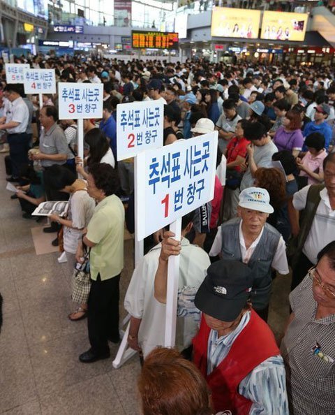 | Người dân Hàn Quốc chen chúc xếp hàng đi mua vé tàu trước ngày lễ truyền thống lớn nhất trong năm là Chuseok, rơi vào ngày 30/9 tới đây. Ảnh: Yonhap. |
