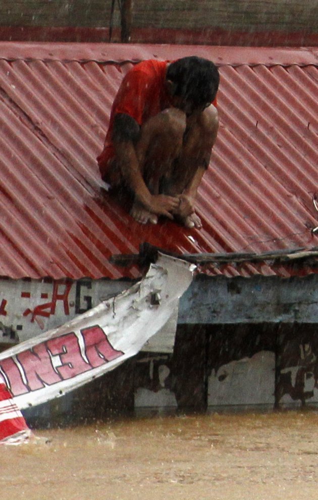 Một người đàn ông ngồi trên nóc nhà đợi cứu hộ tại Marikina, Metro Manila. Mưa lớn, dai dẳng, đã gây lụt lội hầu hết nội đô Manila và các vùng lân cận. Gần 270.000 phải sơ tán, cho đến nay ít nhất đã có 7 người thiệt mạng. Ảnh REUTERS/Erik De Castro