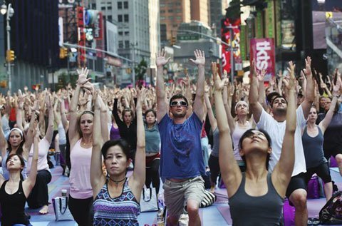 | Hàng nghìn người tham dự buổi trình diễn yoga Hạ chí tại quảng trường Thời đại, New York, Mỹ. (Ảnh: Reuters) |