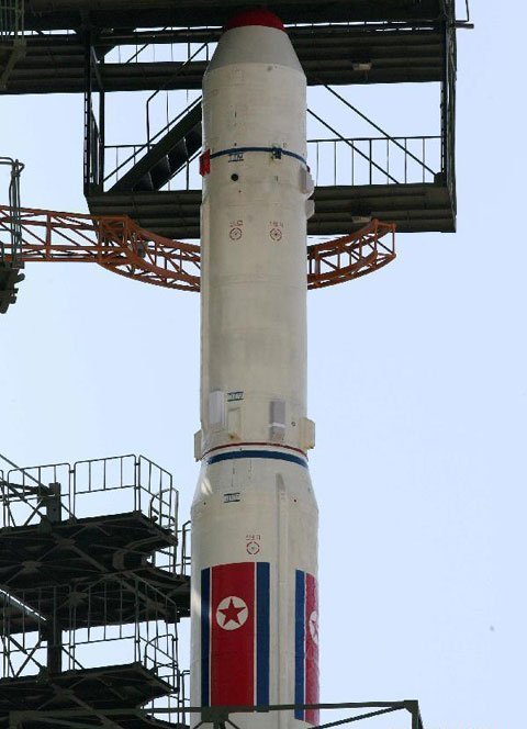 Ảnh chụp ngày 8/4 cho thấy Triều Tiên đã lắp đặt tên lửa tầm xa Unha-3 lên bệ phóng. (Ảnh: THX)