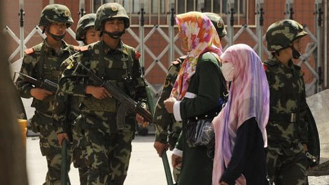 Cảnh sát bán quân sự đi tuần trên đường phố Urumqi, thủ phủ Tân Cương.