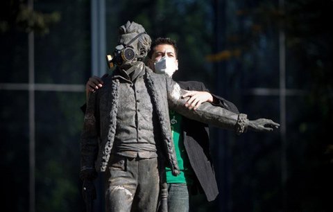 | Một nhà hoạt động vì môi trường đeo mặt nạ phòng độc cho bức tượng trên đại lộ Paseo de la Reforma ở Mexico City. (Ảnh: THX) |