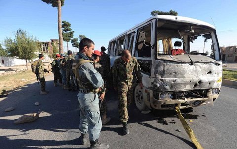 | Các binh sỹ Afghanistan đứng cạnh một chiếc xe bus bị hư hại trong vụ nổ hôm 17/9 ở Herat. (Ảnh: THX) |