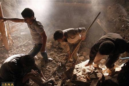 Các đội cứu hộ tìm kiếm các nạn nhân của vụ động đất trong ngôi làng Varzaghan ở Đông Azarbaijan xảy ra vào hôm qua. Hai vụ động đất kép cường độ lớn đã khiến 300 người thiệt mạng và 1.800 người Iran bị thương. Các công nhân đang đào xới tại các ngôi làng suốt cả đêm và ngày để tìm kiếm những người bị nạn. Ảnh: Reuters