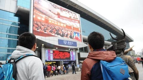 | Người dân Trung Quốc theo dõi lễ khai mạc đại hội 18 của Đảng Cộng sản Trung Quốc tại một nhà ga tàu hỏa ở Quý Châu. (Ảnh: THX) |