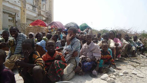 Những đứa trẻ xếp hàng chờ được phân phát thức ăn ở Mogadishu, Somalia hôm 6/7/2011. Cảnh khô hạn và đói kém ở các tỉnh phía nam Somalia đã buộc hàng trăm hộ gia đình phải sơ tán về Mogadishu. (Ảnh: THX).