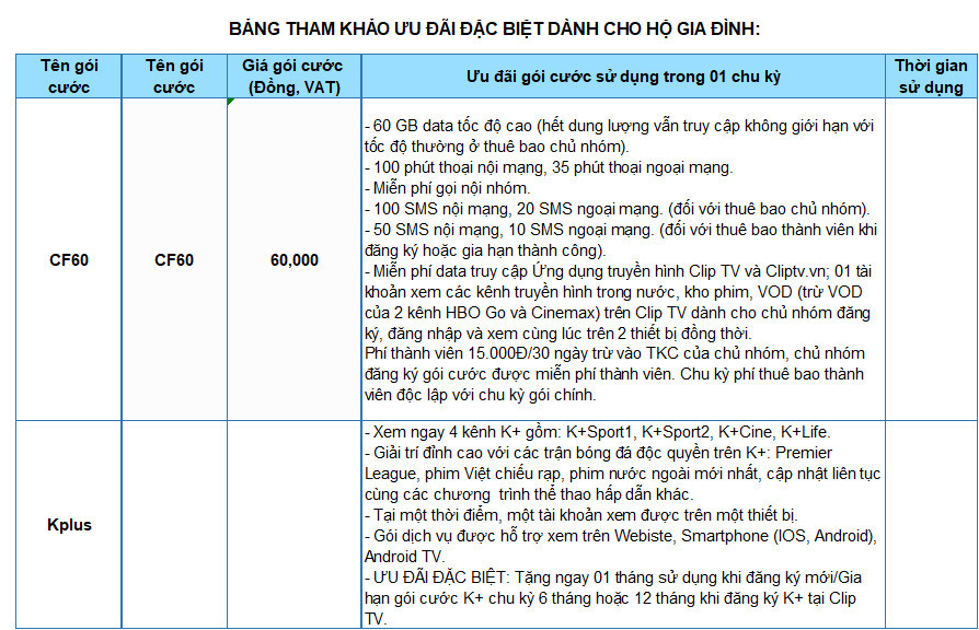 Bảng tham khảo ưu đãi đặc biệt dành cho hộ gia đình: Gói cước CF60