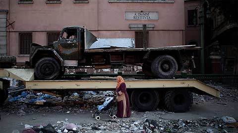 Một phụ nữ đưa con nhỏ đi dạo qua một ôtô bị đốt cháy ở Quảng trường Tahrir ngay sau khi Tổng thống Hosni Mubarak từ chức. (Ảnh: AP)