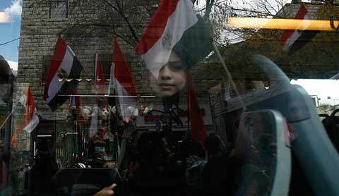 Một cô gái Ảrập nhìn qua cửa sổ xe buýt tại một cuộc tuần hành mừng Hosni Mubarak từ chức ở Nazareth, Israel. (Ảnh: Reuters)