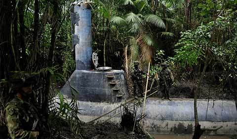 Các binh sĩ Campuchia đứng gác gần một con tàu lặn tự tạo gần Cauca Colombia. Tàu ngầm này, được tìm thấy trên bờ biển phía tây nam Thái Bình Dương tụuộc Colombia, có thể vận chuyển 8 tấn cocaine và có khả năng đi từ Colombia tới Mexico. (Ảnh: Getty)