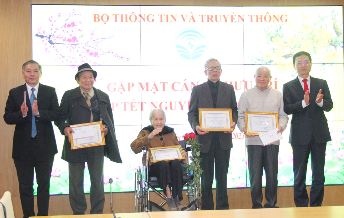 Bộ trưởng Nguyễn Mạnh Hùng và đại diện Ban Liên lạc hưu trí Bộ Thông tin và Truyền thông trao quà mừng thọ cho một số cán bộ hưu trí. (Ảnh: Thảo Anh)