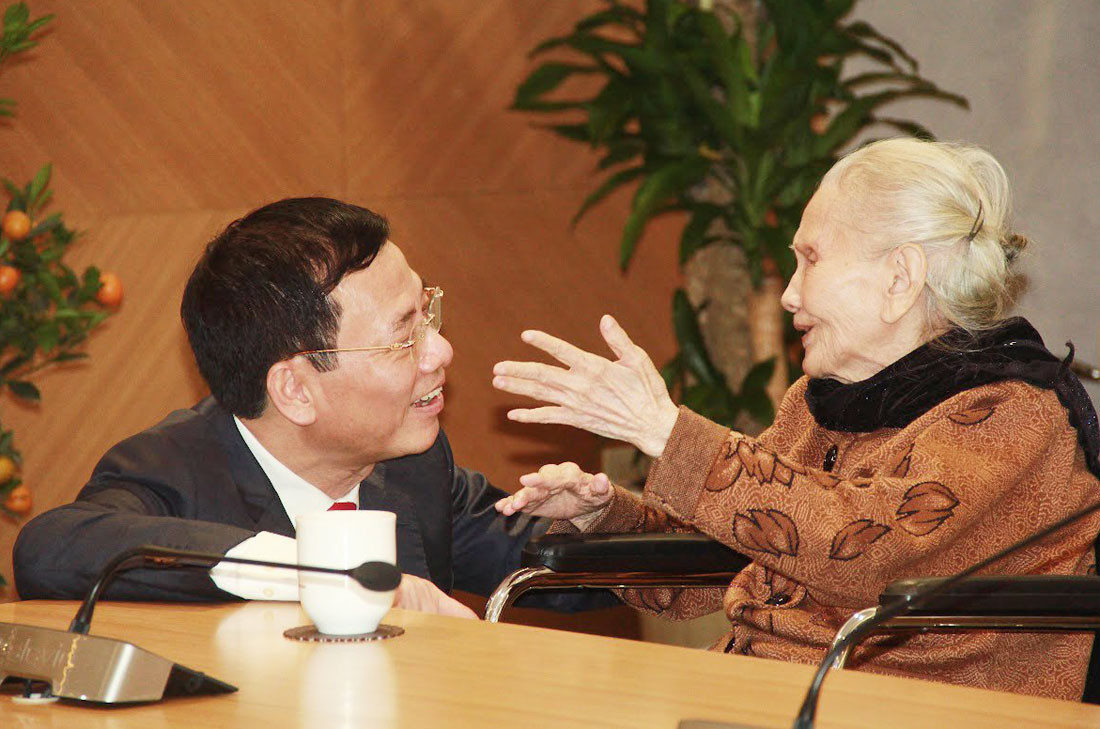 Bộ trưởng Nguyễn Mạnh Hùng hỏi chuyện cụ bà Lê Thị Ninh, 99 tuổi, cán bộ an toàn khu. (Ảnh: Thảo Anh)
