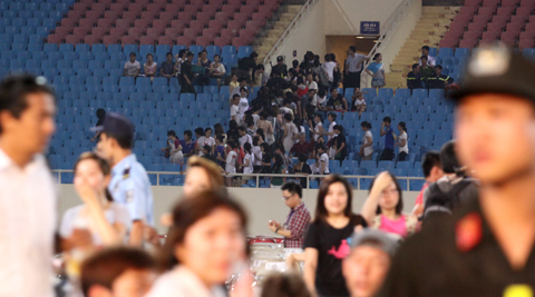 Khán giả từ khán đài tràn xuống hàng ghế dưới sân