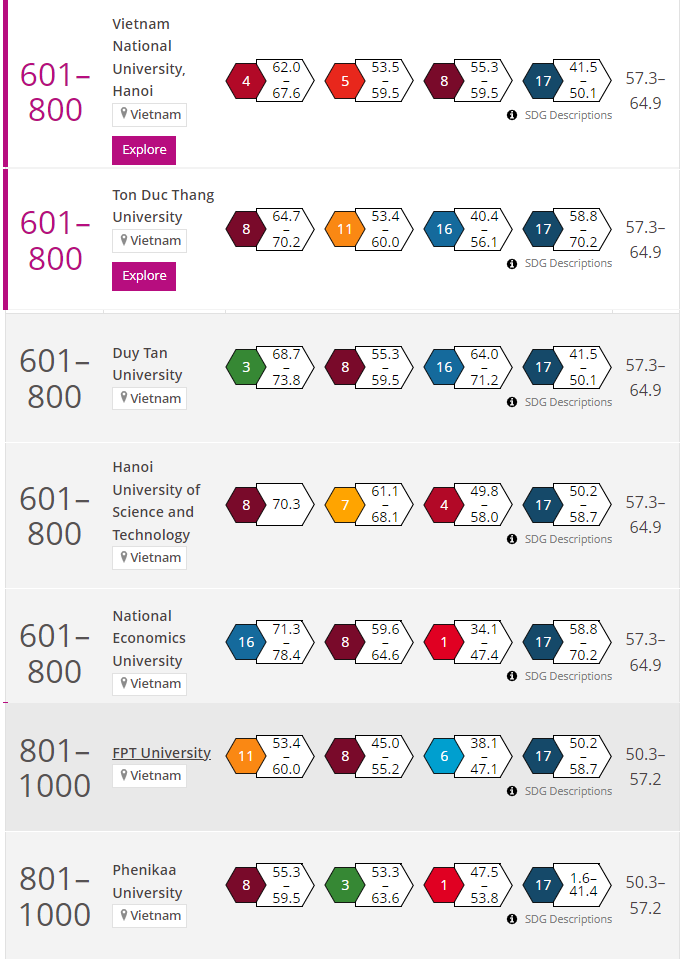 Sáng nay 28/4/2022, Tạp chí Times Higher Education (THE) đã công bố kết quả xếp hạng của bảng xếp hạng THE Impact Rankings. Đây là năm thứ tư Times Higher Education (THE) công bố bảng xếp hạng này nhằm đánh giá sự thành công của các tổ chức giáo dục đại học trong việc thực hiện 17 mục tiêu phát triển bền vững (Sustainable Development Goals - SDGs) của Liên Hợp Quốc.