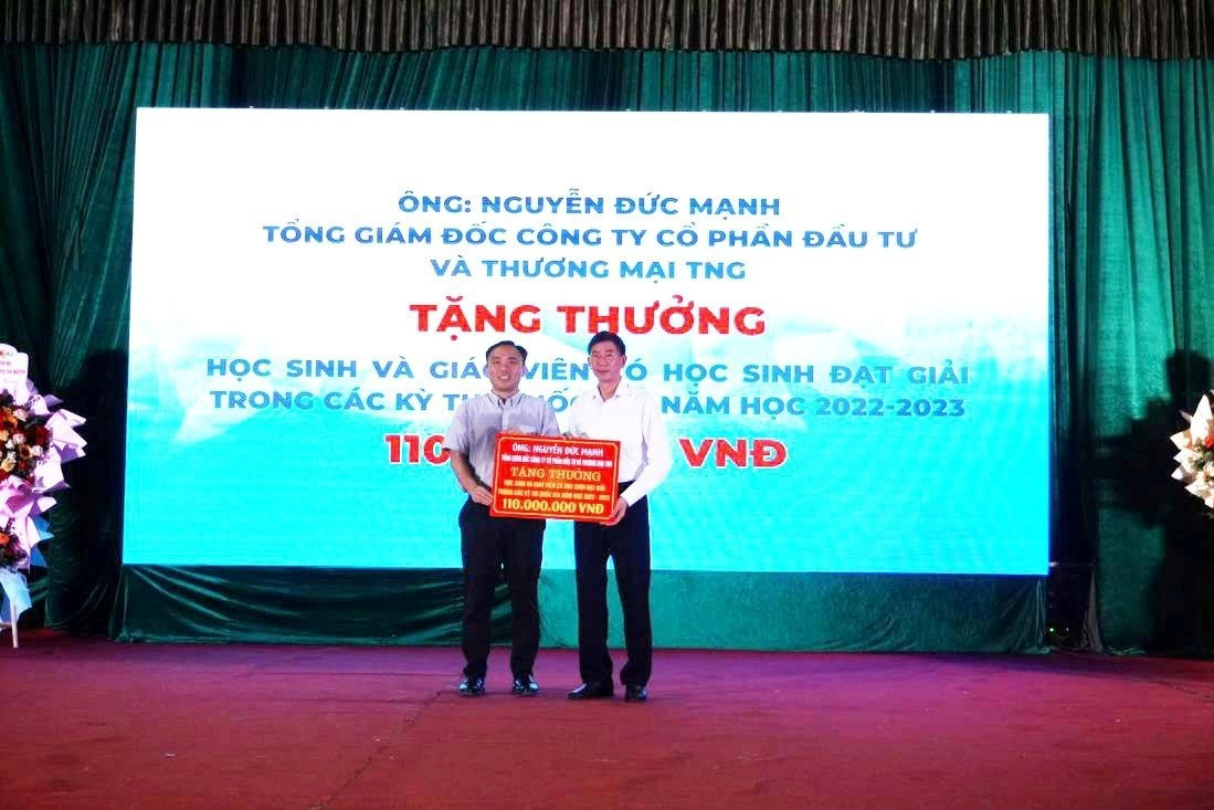 Cũng tại buổi lễ ông Nguyễn Đức Mạnh, Tổng giám đốc Công ty Cổ phần Đầu tư và Thương mại TNG đã trao thưởng cho học sinh và giáo viên đạt giải trong kỳ thi Quốc Gia năm học 2022 - 2023.