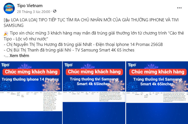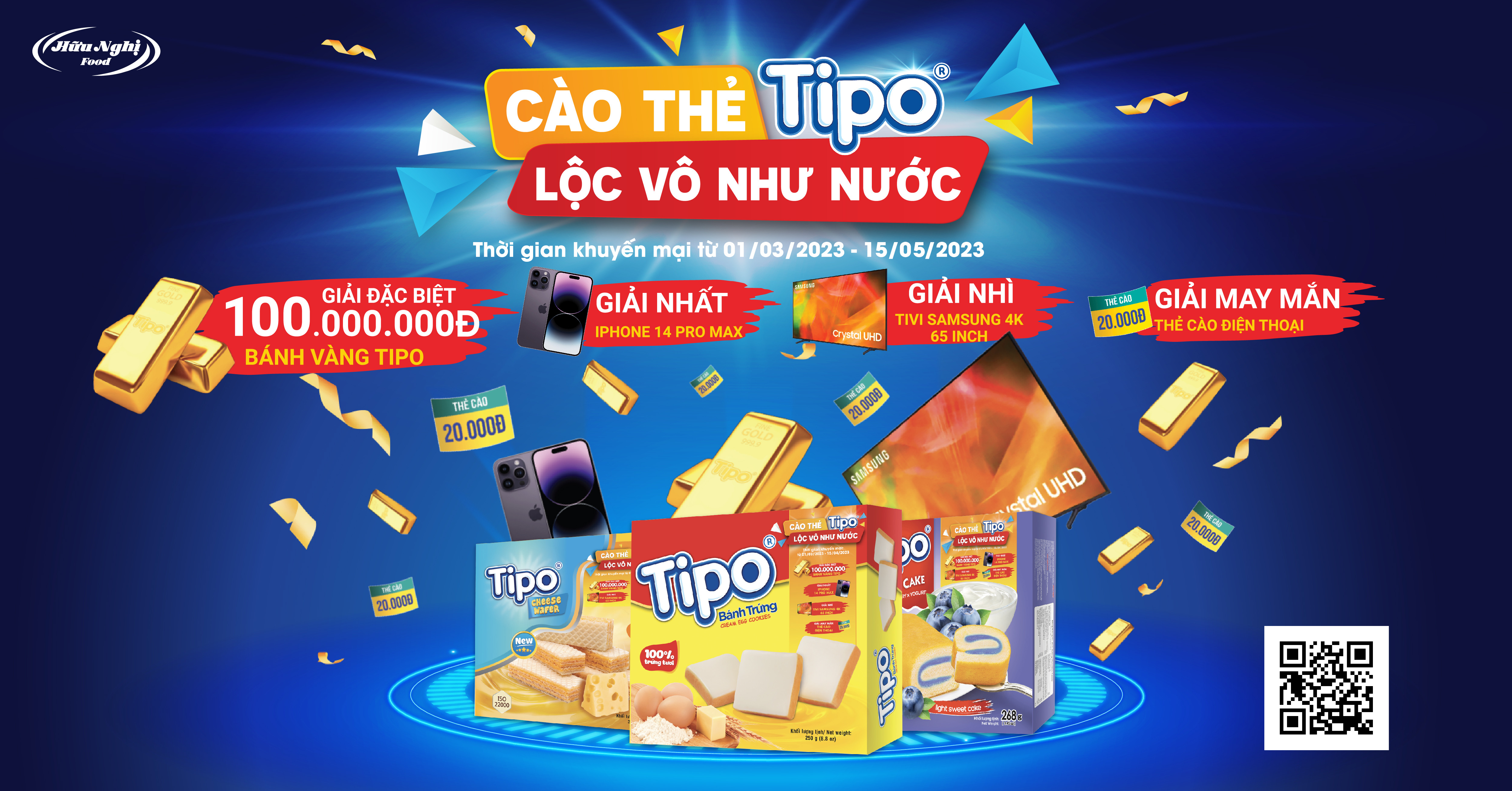 Theo đó, chương trình khuyến mãi “Cào thẻ Tipo - Lộc vô như nước” được công ty gia hạn đến hết ngày 15/5. Khách hàng tham gia chương trình sẽ có cơ hội nhận giải Đặc biệt: bánh vàng Tipo trị giá hơn 100 triệu đồng; giải Nhất: điện thoại Iphone 14 promax 256GB; giải Nhì: Smart Tivi Samsung 4K Crystal UHD 65inch và hàng ngàn giải May mắn là thẻ cào điện thoại mệnh giá 20.000 VNĐ.