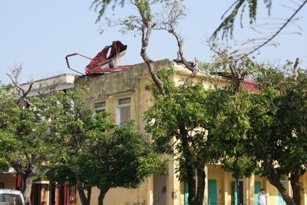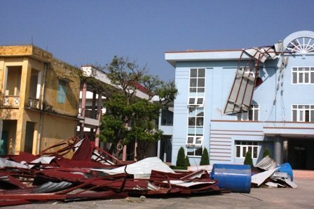 | Mái tôn tại Bệnh viện huyện Giao Thủy bị bão cuốn bay hoàn toàn trong cơn bão số 8. |