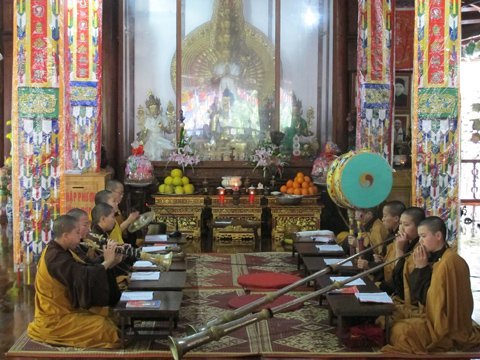 | Được dự một buổi lễ cầu an cũng là một trải nghiệm thú vị với du khách. Không giống với nhiều nơi khác, tại đây các sư cô làm lễ sử dụng nhiều nhạc cụ và đọc kinh có âm hưởng giai điệu rất đặc biệt |