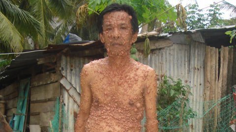 Anh Võ Hồng Quân với những khối u mọc chi chít trên người. |