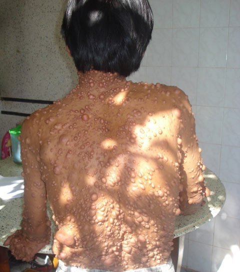 Khi mới sinh ra, anh Quân cũng bụ bẫm và phát triển bình thường, đến khoảng 7-8 tuổi thì những nốt nhỏ đầu tiên xuất hiện trên mặt. Đến năm 15 tuổi thì bướu phát triển rải rác trên khắp cơ thể anh và lan ra hết sức nhanh chóng. Hàng ngàn bướu với hình thù và độ to nhỏ khác nhau, nhiều cái to như quả trứng gà, trứng cút biến anh Quân thành một người có hình thù kỳ dị.