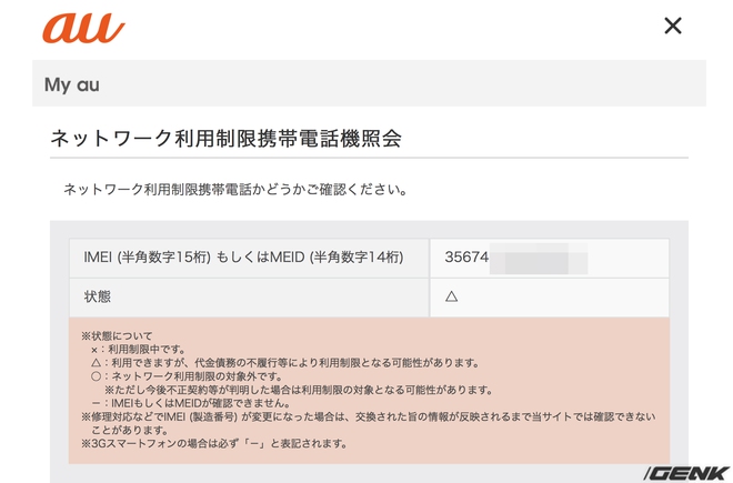 - Máy không báo mất. Để kiểm tra, người dùng có thể truy cập vào website của nhà mạng AU KDDI tại đây và bấm vào nút 次へ (Tiếp tục). Nếu biểu tượng hình tròn (O) hoặc hình tam giác (△) hiện ra nghĩa là iPhone của bạn đủ điều kiện unlock. Còn nếu biểu tượng dấu X hiện ra, tiếc rằng chiếc iPhone của bạn đã bị báo mất và không thể unlock được.
