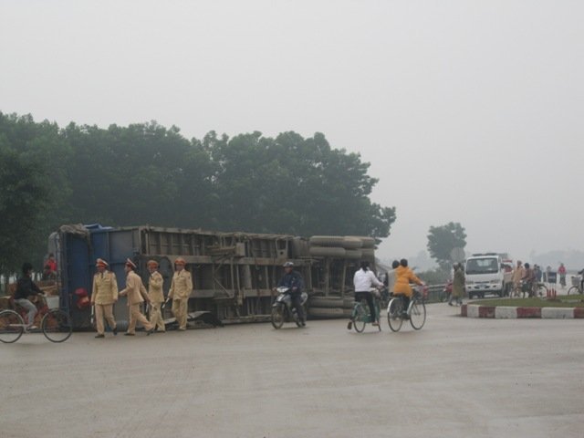| Hiện trường vụ tai nạn, thùng xe nằm ngả giữa đường. |