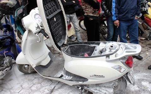Ba ngày sau, trưa 12/12, trên phố Kim Mã (Hà Nội), xe SH đang đi bỗng đổ ra đường rồi bốc cháy ngùn ngụt. Sau 10 phút, xe cháy trơ khung sắt, chỉ còn lại bánh sau.