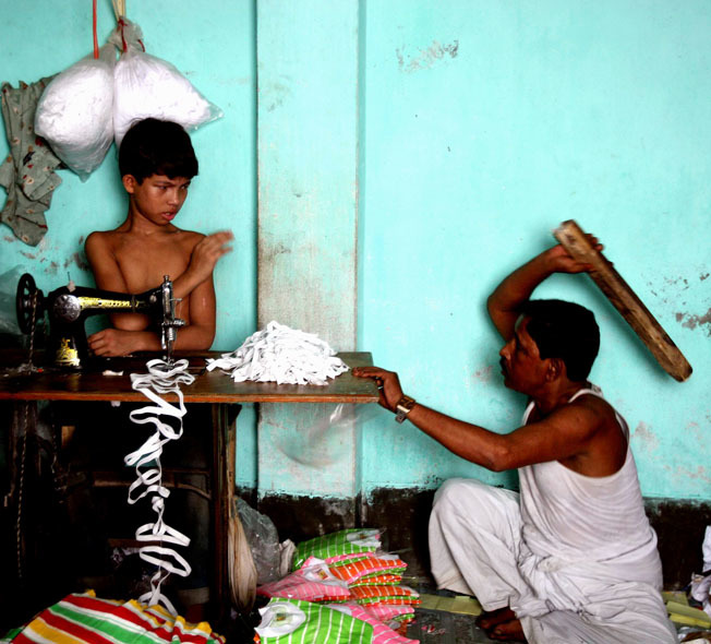 ảnh cậu bé 12 tuổi bị đánh vì may chiếc áo phông quá chậm. Bức ảnh này đã thu