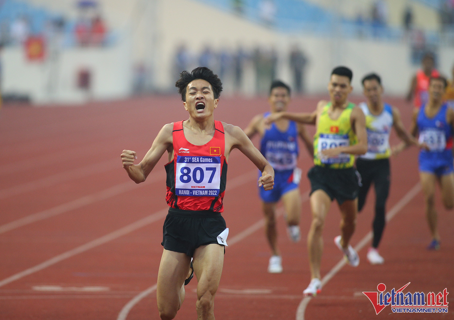 Sau khi đứng thứ 2 vòng loại, Ngần Ngọc Nghĩa được kỳ vọng giành HCV ở nội dung chạy 200m nam. Tuy nhiên ở chung kết, Puripol Boonson của Thái Lan (phải) đã thi đấu xuất sắc, cán đích ở vị trí đầu tiên với thành tích 20 giây 37. Thông số này giúp thần đồng 16 tuổi của điền kinh Thái Lan phá kỷ lục SEA GamesỞ nội dung 1.500m nam, Việt Nam có 2 VĐV tranh tài là Trần Văn Đảng và Lương Đức PhướcĐức Phước là người cán đích đầu tiên, giành HCVTrần Văn Đảng cũng thi đấu rất nỗ lực và giành HCBĐức Phước ăn mừng tấm HCVTrong khi đó Hoài Văn với chiến thuật "đặc biệt" là giấu đối thủ bị chấn thương, giành tấm HCV ném laoTâm điểm ở nội dung chạy 5.000m nữ là hai cô gái vàng Nguyễn Thị Oanh và Phạm Thị Hồng LệNguyễn Thị Oanh giành HCV, trong khi người đồng đội giành HCB. Đây là tấm HCV thứ 2 trong ngày của Nguyễn Thị OanhPhó Thủ tướng Vũ Đức Đam xuống sân chúc mừng hai tuyển thủ điền kinh Việt NamMục tiêu giành 5 HCV trong ngày thi đấu đầu tiên của đội tuyển điền kinh Việt Nam bất thành khi đội tiếp sức 4x400m nam-nữ không bảo vệ được ngôi vô địch. Nguyễn Thị Huyền là VĐV thi đấu tốt nhất, nhưng các đồng đội của cô có một ngày không đạt phong độ cao, qua đó chỉ giành HCB. Vì vậy điền kinh Việt Nam giành tổng số 4 HCV ở ngày thi đấu chính thức đầu tiên của môn điền kinh SEA Games 31.Đội tuyển điền kinh Việt Nam đặt mục tiêu 15-17 HCV, xếp nhất toàn đoàn ở môn "Nữ hoàng" tại SEA Games 31.