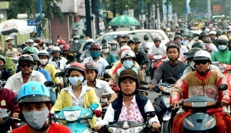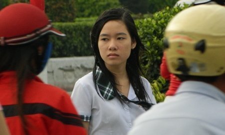 | Một nữ sinh kẹt giữa những xe máy khi băng đường qua làn có xe buýt lưu thông. |